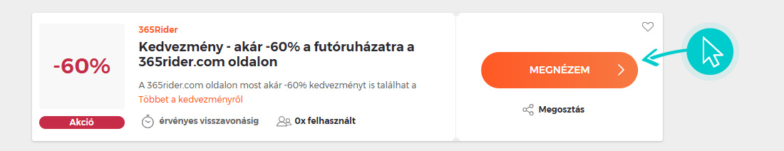 Válassz ki egyet a 365Rider kedvezmények közül és kattints a „Megnézem” gombra. Ezt követően átirányítunk a 365Rider webáruházba egyenesen a 365rider.com akciós kínálatához, ahol megvásárolhatod a terméket kedvezményesen.