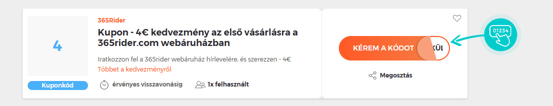 Válassz ki egy kuponkódot, amelyet szeretnél felhasználni a 365rider.com webáruházban. Kattints a narancssárga "Kérem a kódot" gombra.