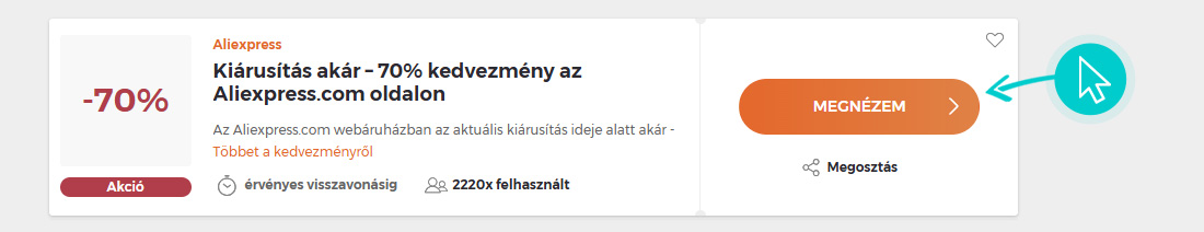 Válassz ki egyet az AliExpress kedvezmények közül és kattints a „Megnézem” gombra. Ezt követően átirányítunk az AliExpress webáruházba egyenesen az Aliexpress.com akciós kínálatához, ahol megvásárolhatod a terméket kedvezményesen.