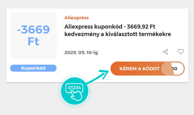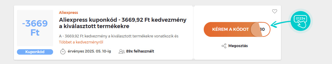 Válassz ki egy kedvezménykódot, amelyet szeretnél felhasználni az Aliexpress.com webáruházban. Kattints a narancssárga "Kérem a kódot" gombra!