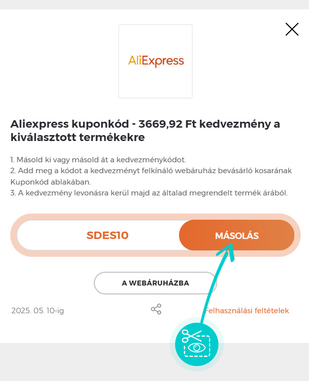Másold ki vagy másold át a kódot és kattints a „Tovább a webáruházba” gombra. Ezt követően átirányítunk az AliExpress webáruházba.