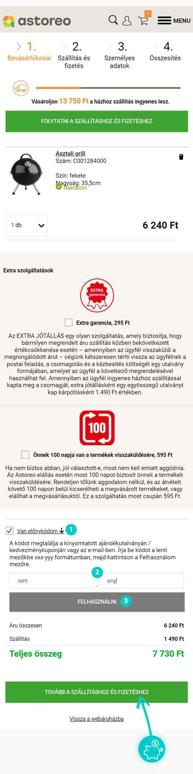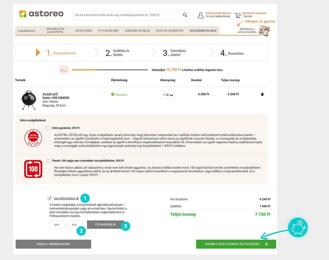 Válaszd ki a webáruházban a kívánt terméket, majd kattints a „Kosárba teszem” gombra és termék automatikusan a bevásárlókosárba kerül. A bevásárlókosárban a kiválasztott termékek alatt találod a "A van előnykódom" ablakot. Itt megadatod a kedvezménykódot a kód bemásolásával, vagy manuálisan beírva, majd érvényesítsd a „Felhasználni” gombbal.