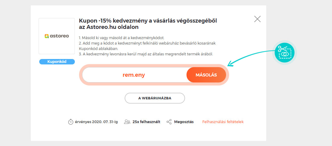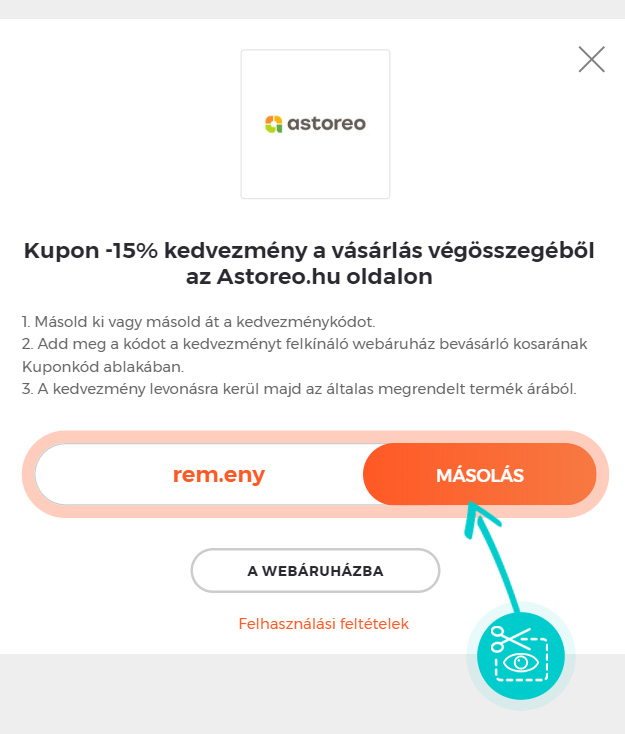 Másold ki vagy másold át a kódot és kattints „ A webáruházba” gombra. Ezt követően átirányítunk az Astoreo.hu webáruházba.