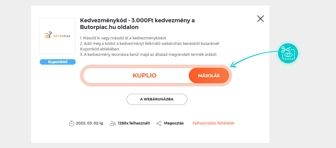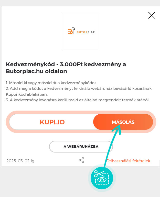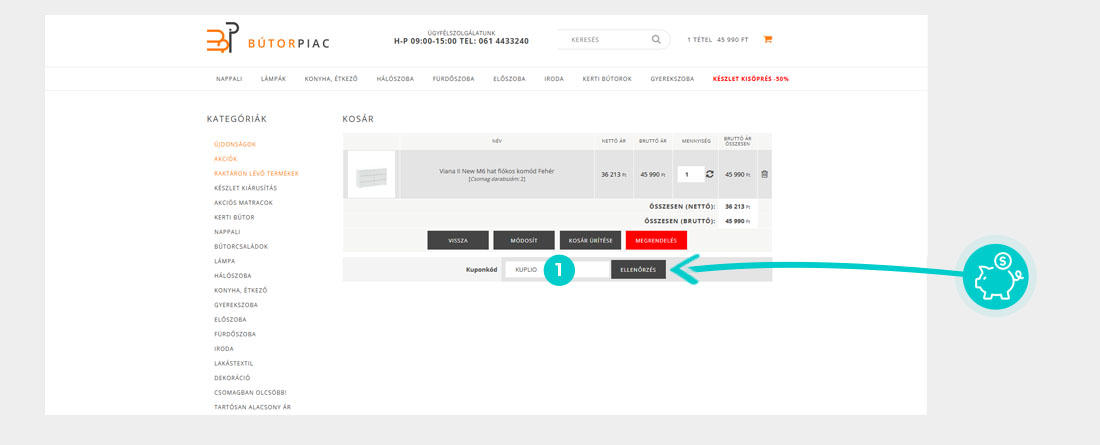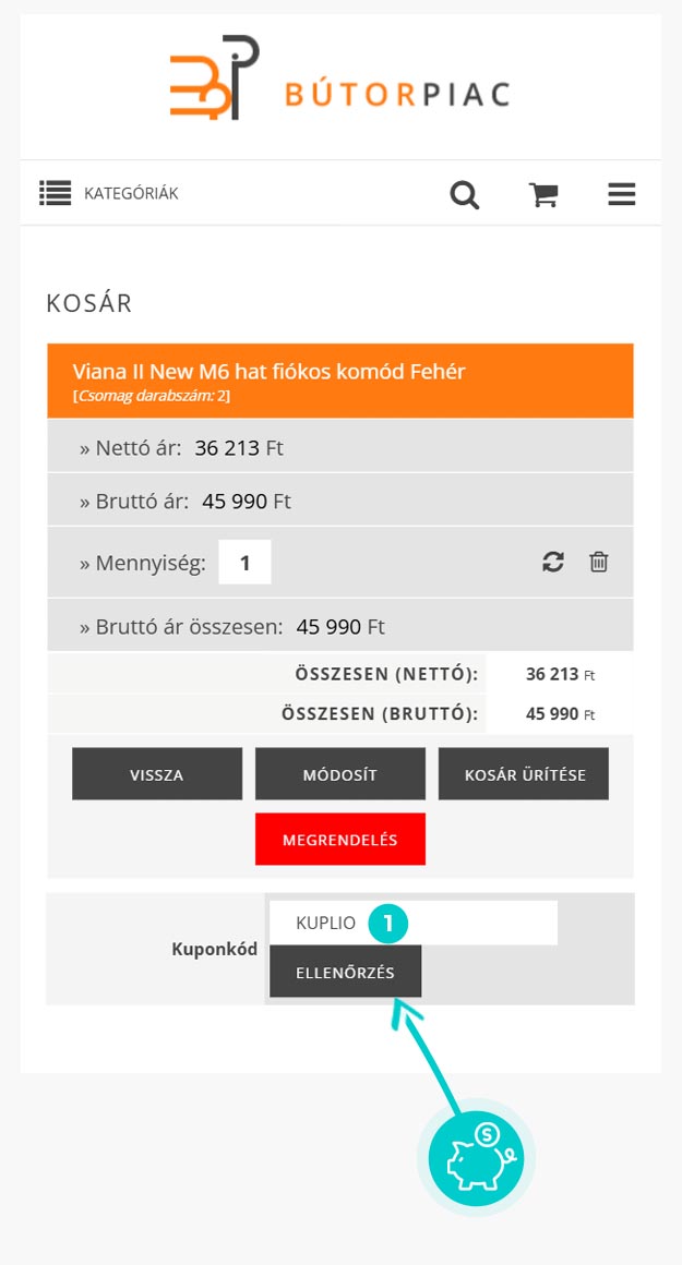 Másold ki vagy másold át a kódot és kattints „A webáruházba” gombra. Ezt követően átirányítunk a Bútorpiac webáruházba.