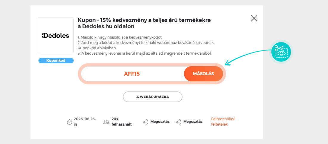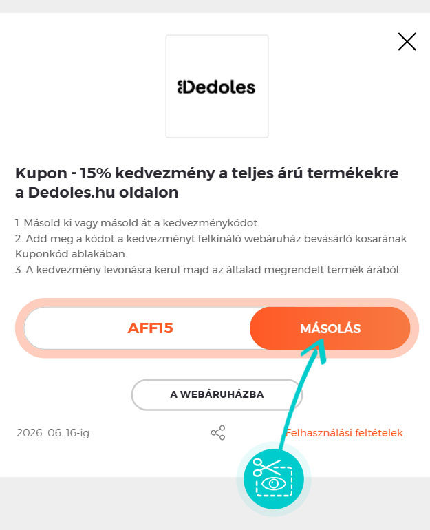 Másold ki vagy másold át a kódot és kattints a „Tovább a webáruházba” gombra. Ezt követően átirányítunk a Dedoles.hu webáruházba.