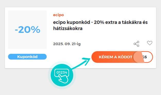 Válassz ki egy kedvezménykódot, amelyet szeretnél felhasználni az ecipo.hu webáruházban. Kattints a narancssárga "Kérem a kódot" gombra!