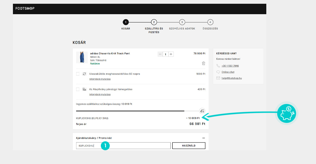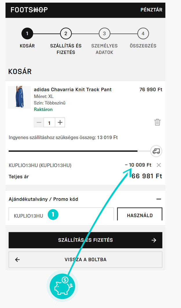 A -10% kedvezmény a teljes árú cipőkre és ruhákra vonatkozik a Footshop.hu webáruházban, ahol a kedvezmény kódot a kosárban adja meg a Rendelkezem kuponkóddal ablakban. A legjobb kuponkódokat a Kuplio.hu oldalon találja. Használja ki a Footshop kedvezménykuponjait, és vásároljon olcsóbban tenisz cipőket, pólókat, pulóvereket és sildes sapkákat.