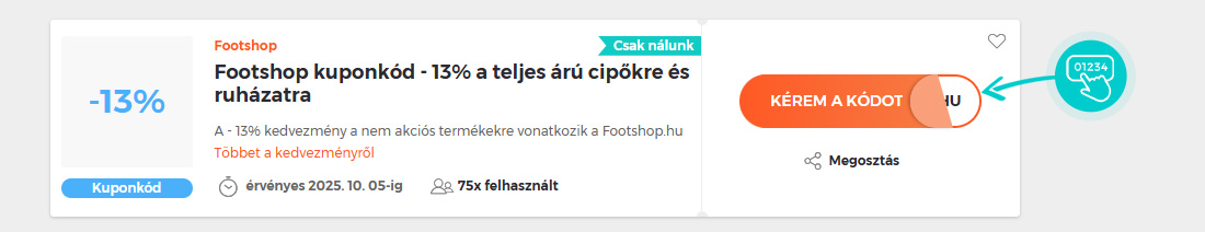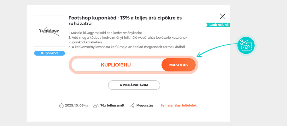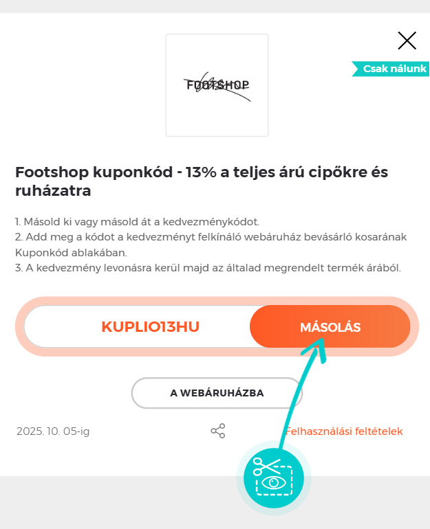 Másold ki vagy másold át a kódot és kattints „A webáruházba” gombra. Ezt követően átirányítunk a Footshop.hu webáruházba.