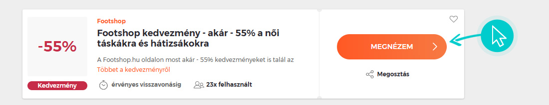 Válassz ki egyet a Footshop kedvezmények közül és kattints a „Megnézem” gombra. Ezt követően átirányítunk a Footshop webáruházba egyenesen a Footshop.hu akciós kínálatához, ahol megvásárolhatod a terméket kedvezményesen.