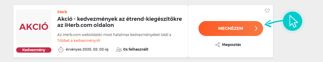Válassz ki egyet az iHerb kedvezmények közül és kattints a „Megnézem” gombra. Ezt követően átirányítunk az iHerb webáruházba egyenesen az iHerb webshop oldalára, ahol megvásárolhatod a terméket kedvezményesen.