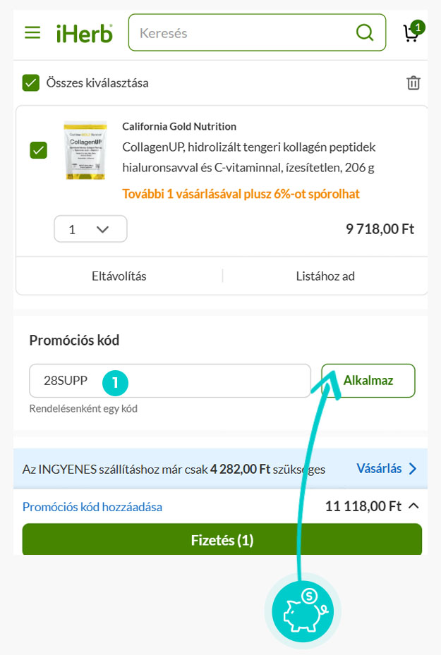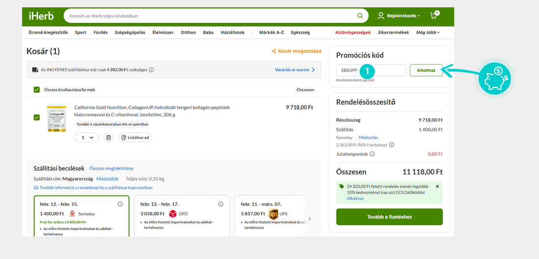 Válaszd ki a webáruházban a kívánt terméket, majd kattints a „Kosárba” gombra és termék automatikusan a bevásárlókosárba kerül. A bevásárlókosárban a kiválasztott termékek mellett találod a "Promóciós kód" ablakot. Itt megadhatod a kedvezménykódot a kód bemásolásával, vagy manuálisan beírva, majd érvényesítsd az „Alkalmaz” gombbal.