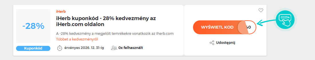 Válassz ki egy kedvezménykódot, amelyet szeretnél felhasználni az iHerb.com webáruházban. Kattints a narancssárga "Kérem a kódot" gombra!