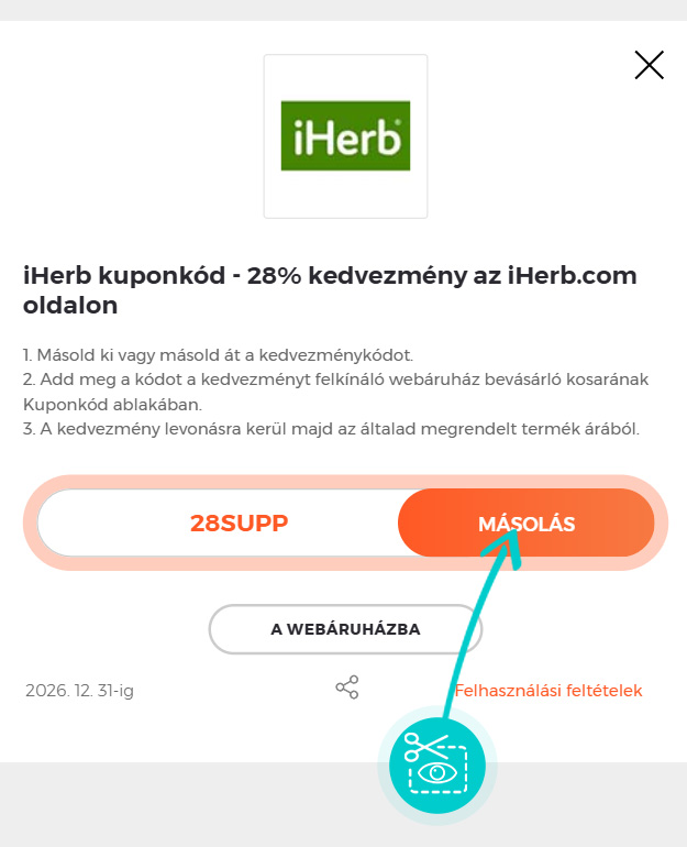 Másold ki vagy másold át a kódot és kattints a „Tovább a webáruházba” gombra. Ezt követően átirányítunk az iHerb.com webáruházba.