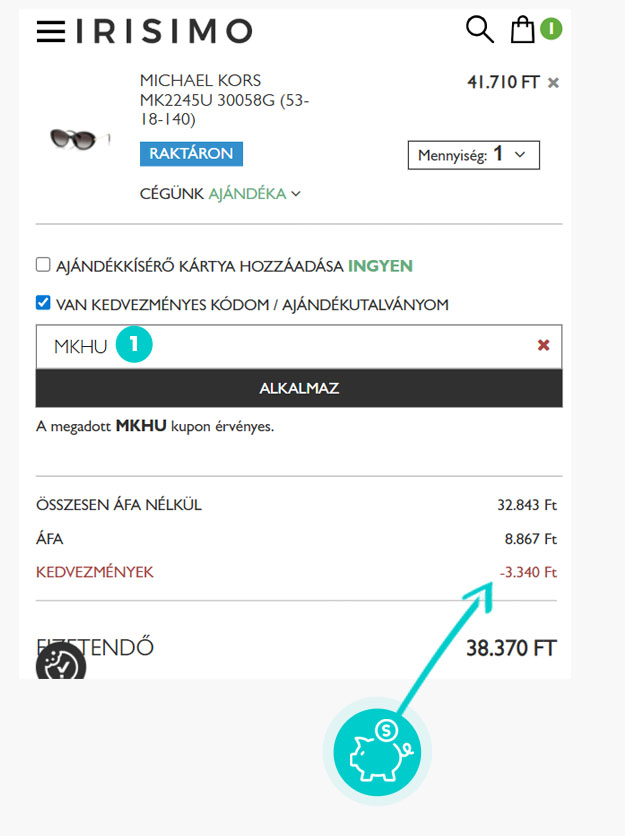 Többet a kedvezményrőlA - 10% kedvezmény a megjelölt Michael Kors napszemüvegekre vonatkozik az Irisimo.hu oldalon, ahol a kedvezménykódot a kosárban adja meg.