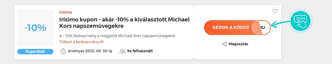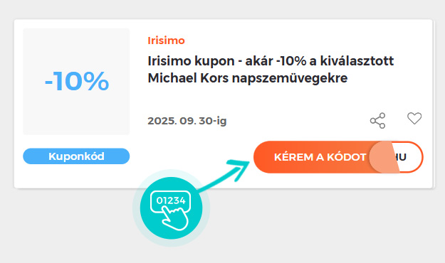 Válassz ki egy kedvezménykódot, amelyet szeretnél felhasználni az Irisimo.com webáruházban. Kattints a narancssárga "Kérem a kódot" gombra!