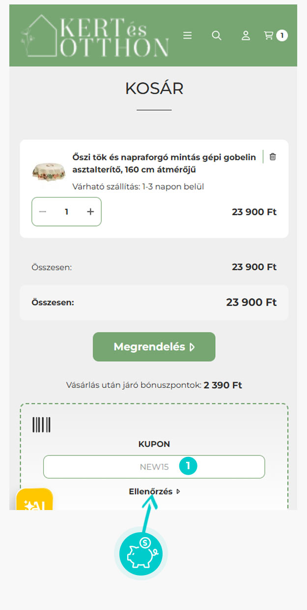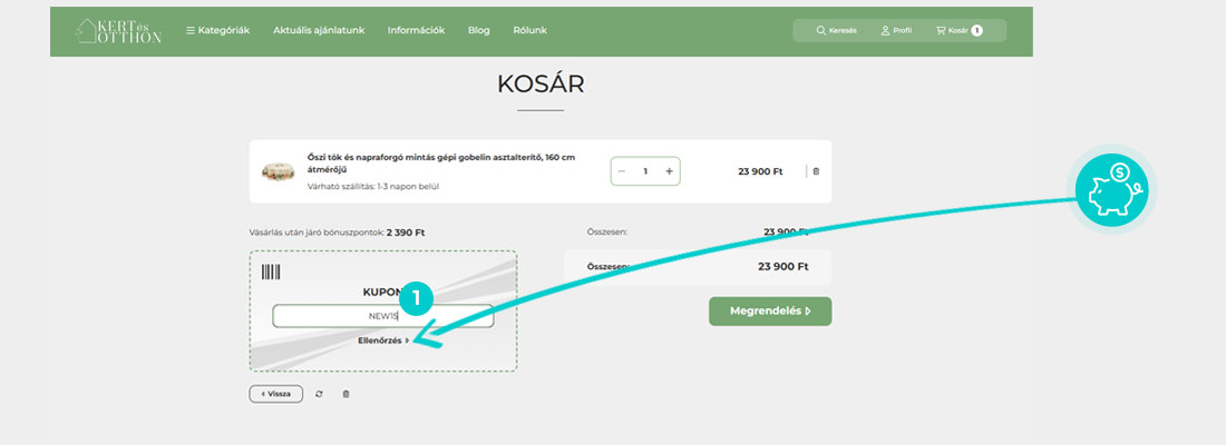 Válaszd ki a webáruházban a kívánt terméket, majd kattints a „Kosárba” gombra és termék automatikusan a bevásárlókosárba kerül. A bevásárlókosárban a kiválasztott termékek mellett találod a "Kuponkód" ablakot. Itt megadhatod a kedvezménykódot a kód bemásolásával, vagy manuálisan beírva, majd érvényesítsd a „Alkalmaz” gombbal.