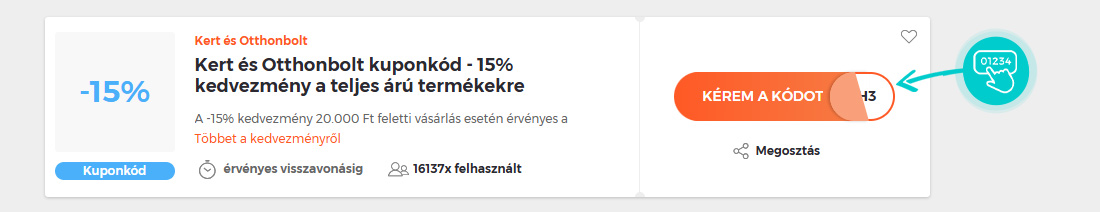 Válassz ki egy kedvezménykódot, amelyet szeretnél felhasználni a Kertesotthonbolt.hu webáruházban. Kattints a narancssárga "Kérem a kódot" gombra!