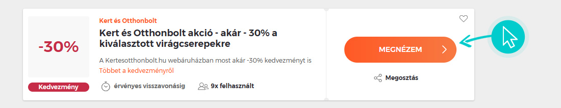 Válassz ki egyet a Kert és Otthonbolt kedvezmények közül és kattints a „Megnézem” gombra. Ezt követően átirányítunk a Kert és Otthonbolt webáruházba egyenesen a Kert és Otthonbolt webshop oldalára, ahol megvásárolhatod a terméket kedvezményesen.