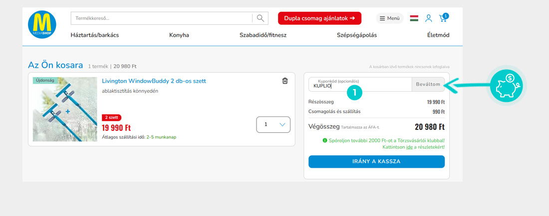 Válaszd ki a webáruházban a kívánt terméket, majd kattints a „Megrendelem” gombra és termék automatikusan a bevásárlókosárba kerül. A bevásárlókosárban a kiválasztott termékek alatt találod az "Kuponja van? Váltsa be itt!" ablakot. Itt megadhatod a kedvezménykódot a kód bemásolásával, vagy manuálisan beírva, majd érvényesítsd a „Kupon érvényesítése” gombbal.