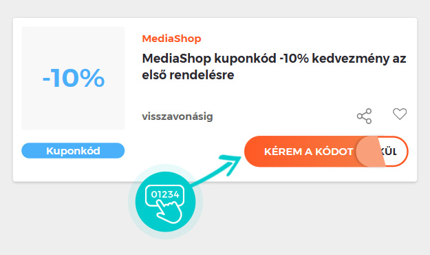 Válassz ki egy kedvezménykódot, amelyet szeretnél felhasználni a Mediashop.hu webáruházban. Kattints a narancssárga "Kérem a kódot" gombra!
