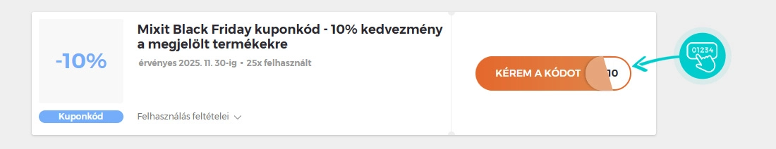 Válassz ki egy kedvezménykódot, amelyet szeretnél felhasználni a Mixit.hu webáruházban. Kattints a narancssárga "Kérem a kódot" gombra!