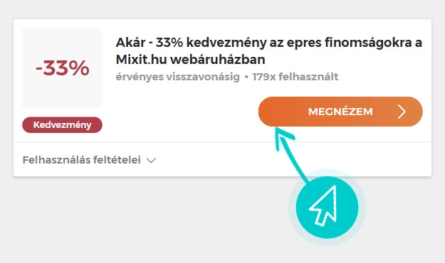 Válassz ki egyet a Mixit kedvezmények közül és kattints a „Megnézem” gombra. Ezt követően átirányítunk a Mixit webáruházba egyenesen a Mixit webshop oldalára, ahol megvásárolhatod a terméket kedvezményesen.