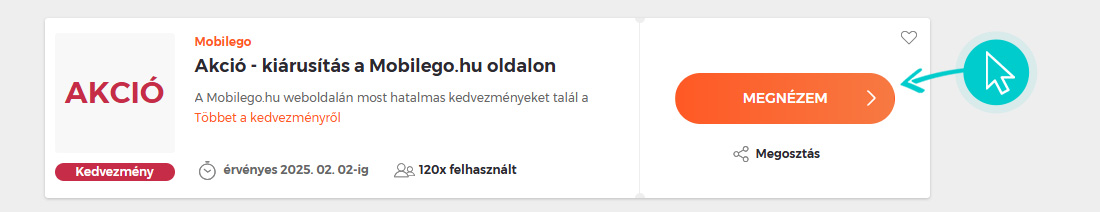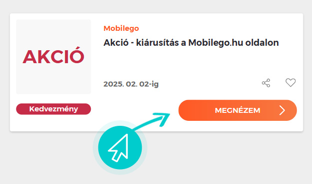Válassz ki egyet a Mobilego kedvezmények közül és kattints a „Megnézem” gombra. Ezt követően átirányítunk a Mobilego webáruházba egyenesen a Mobilego.hu akciós kínálatához, ahol megvásárolhatod a terméket kedvezményesen.