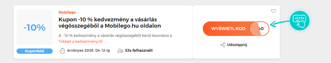 Válassz ki egy kuponkódot, amelyet szeretnél felhasználni a Mobilego.hu webáruházban. Kattints a narancssárga "Kérem a kódot" gombra.