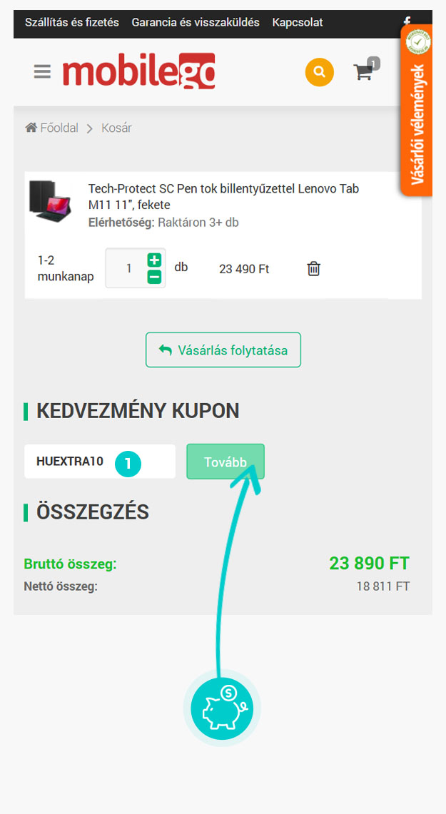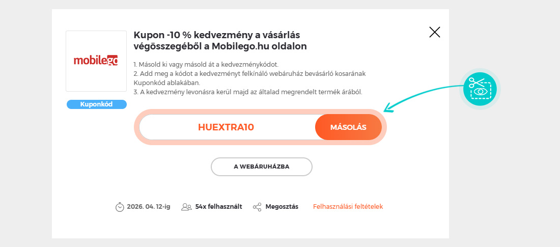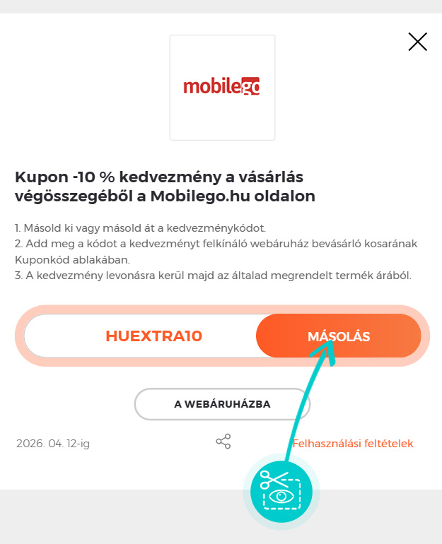 Másold ki vagy másold át a kuponkódot és kattints „A webáruházba” gombra. Ezt követően átirányítunk a Mobilego.hu webáruházba.
