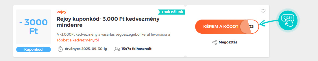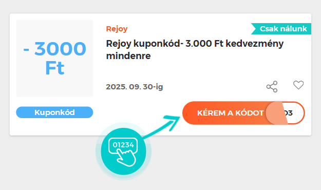 Válassz ki egy kedvezménykódot, amelyet szeretnél felhasználni a Rejoy.hu webáruházban. Kattints a narancssárga "Kérem a kódot" gombra!