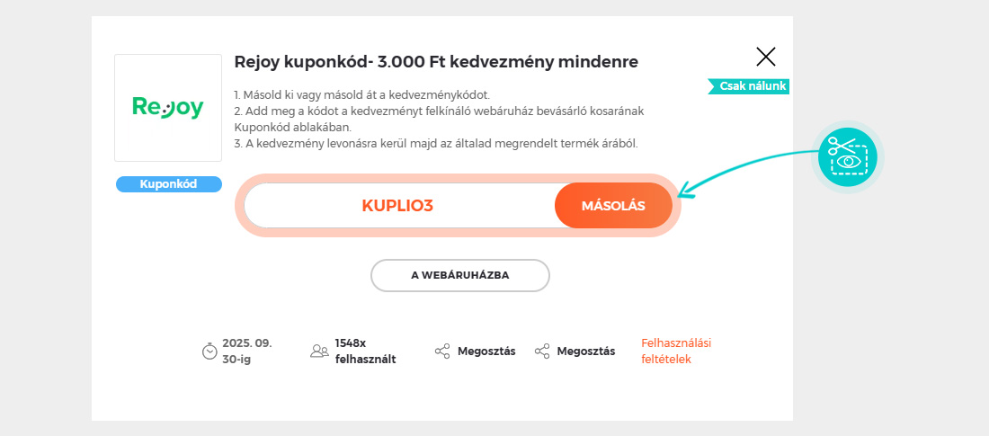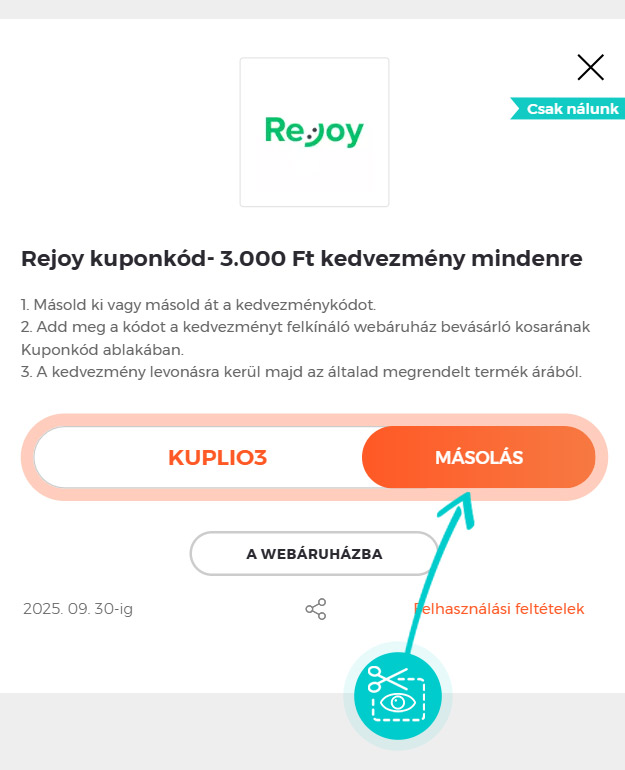 Másold ki vagy másold át a kódot és kattints a „Tovább a webáruházba” gombra. Ezt követően átirányítunk a Rejoy.hu webáruházba.