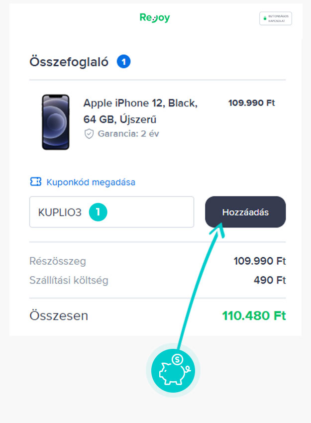 Válaszd ki a webáruházban a kívánt terméket, majd kattints a „Kosárba” gombra és termék automatikusan a bevásárlókosárba kerül. A bevásárlókosárban a kiválasztott termékek mellett találod a "Kuponkód megadása" ablakot. Itt megadhatod a kedvezménykódot a kód bemásolásával, vagy manuálisan beírva, majd érvényesítsd a „Hozzáadás” gombbal.
