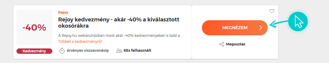 Válassz ki egyet a Rejoy kedvezmények közül és kattints a „Megnézem” gombra. Ezt követően átirányítunk a Rejoy webáruházba egyenesen a Rejoy webshop oldalára, ahol megvásárolhatod a terméket kedvezményesen.