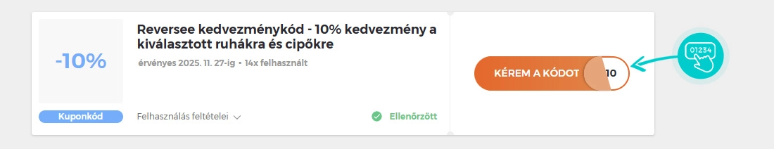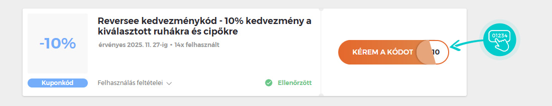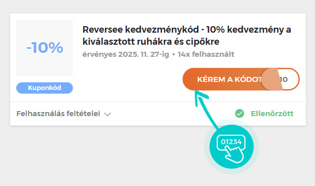 Válassz ki egy kedvezménykódot, amelyet szeretnél felhasználni a Reversee.hu webáruházban. Kattints a narancssárga "Kérem a kódot" gombra!