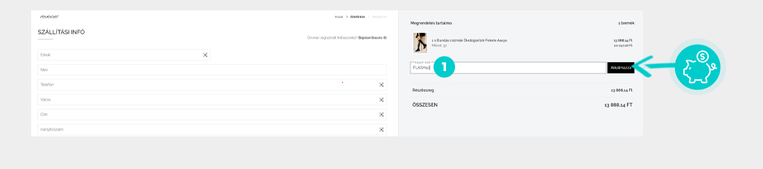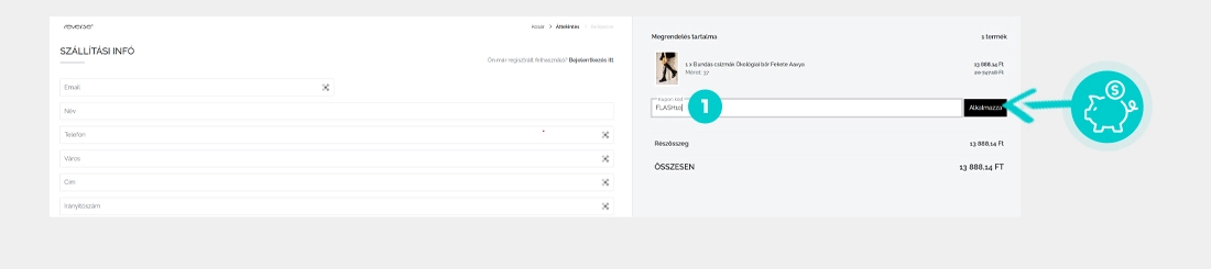 Válaszd ki a webáruházban a kívánt terméket, majd kattints a „Kosárba helyez” gombra és termék automatikusan a bevásárlókosárba kerül. A bevásárlókosárban a kiválasztott termékek alatt találod a "Kuponkód beváltás" ablakot. Itt megadhatod a kedvezménykódot a kód bemásolásával, vagy manuálisan beírva, majd érvényesítsd a „Beváltás” gombbal.