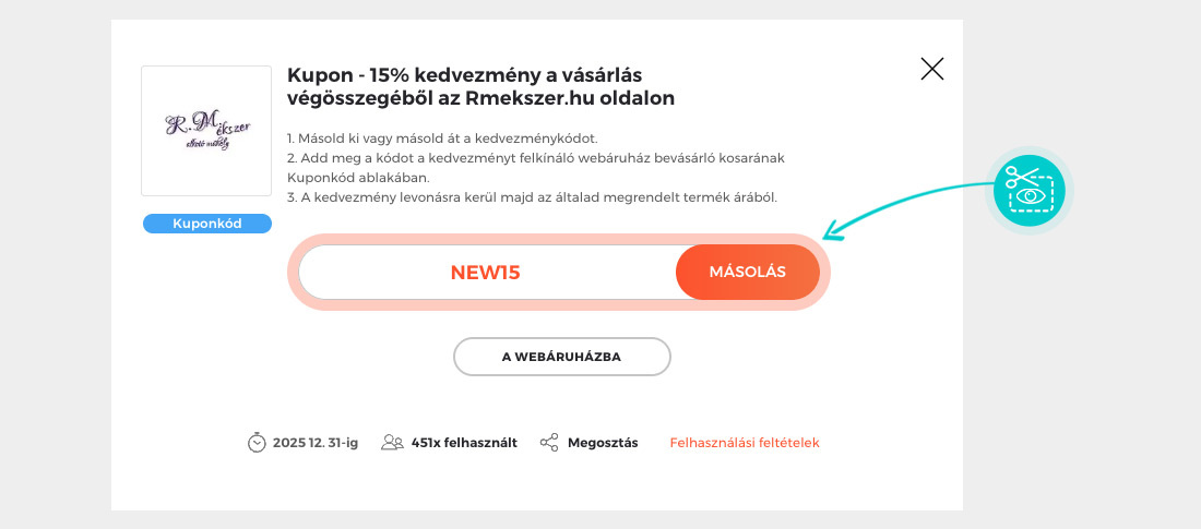 Másold ki vagy másold át a kódot és kattints a „Tovább a webáruházba” gombra. Ezt követően átirányítunk az Rmekszer.hu webáruházba.
