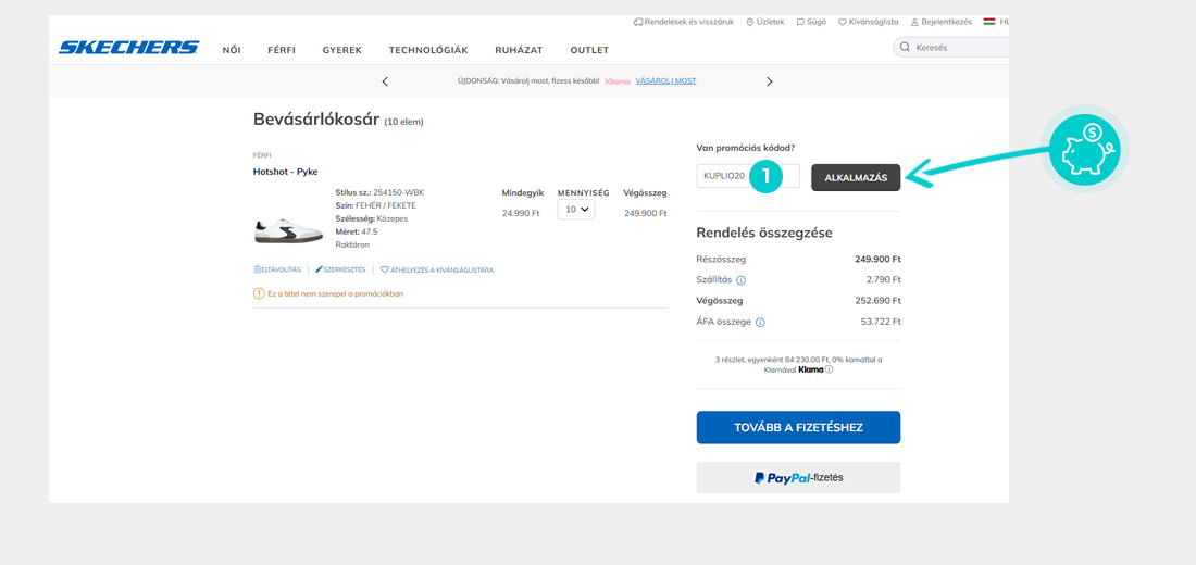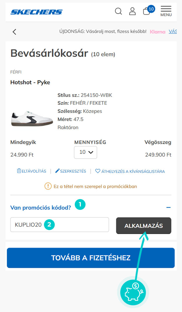 Válaszd ki a webáruházban a kívánt terméket, majd kattints a „Kosárba” gombra és termék automatikusan a bevásárlókosárba kerül. A bevásárlókosárban a kiválasztott termékek mellett találod a "Kuponkód" ablakot. Itt megadhatod a kedvezménykódot a kód bemásolásával, vagy manuálisan beírva, majd érvényesítsd a „Alkalmaz” gombbal.