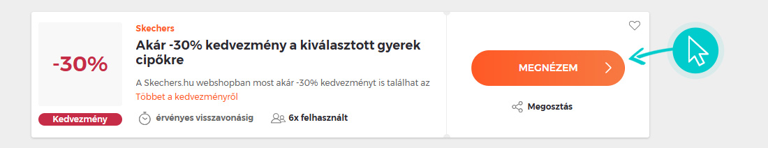 Válassz ki egyet a Skechers kedvezmények közül és kattints a „Megnézem” gombra. Ezt követően átirányítunk a Skechers webáruházba egyenesen a Skechers webshop oldalára, ahol megvásárolhatod a terméket kedvezményesen.