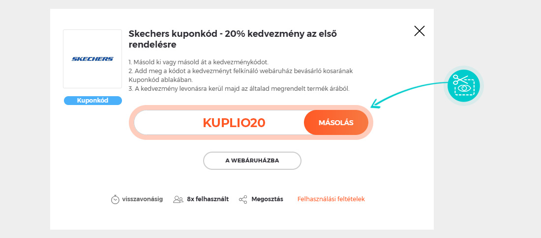 Válassz ki egy kedvezménykódot, amelyet szeretnél felhasználni a Skechers.hu webáruházban. Kattints a narancssárga "Kérem a kódot" gombra!