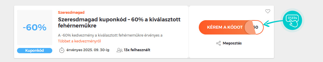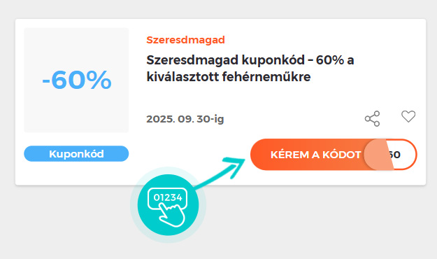 Válassz ki egy kedvezménykódot, amelyet szeretnél felhasználni a Szeresdmagad webáruházban. Kattints a narancssárga "Kérem a kódot" gombra!