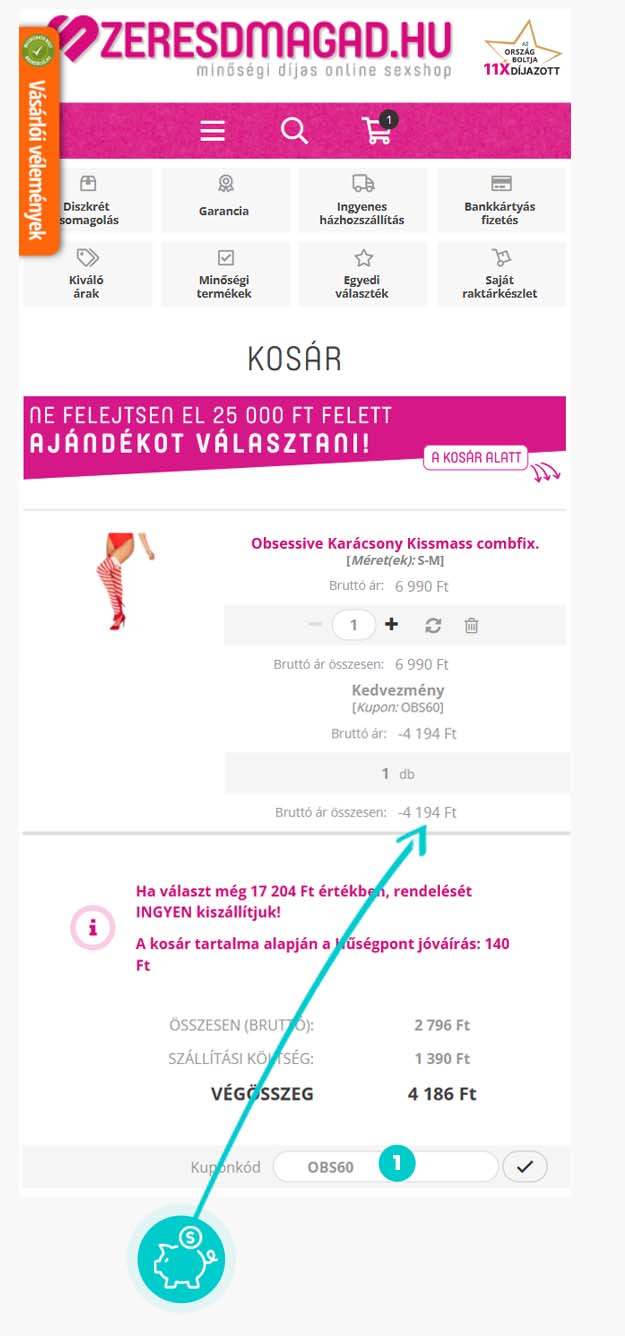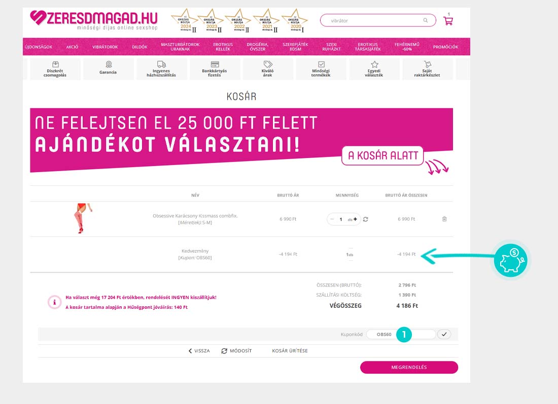 Válaszd ki a webáruházban a kívánt terméket, majd kattints a „Kosárba helyez” gombra és termék automatikusan a bevásárlókosárba kerül. A bevásárlókosárban a kiválasztott termékek alatt találod az "Az ajándékkupon vagy a kedvezmény kódja" ablakot. Itt megadhatod a kedvezménykódot a kód bemásolásával, vagy manuálisan beírva, majd érvényesítsd az „OK” gombbal.