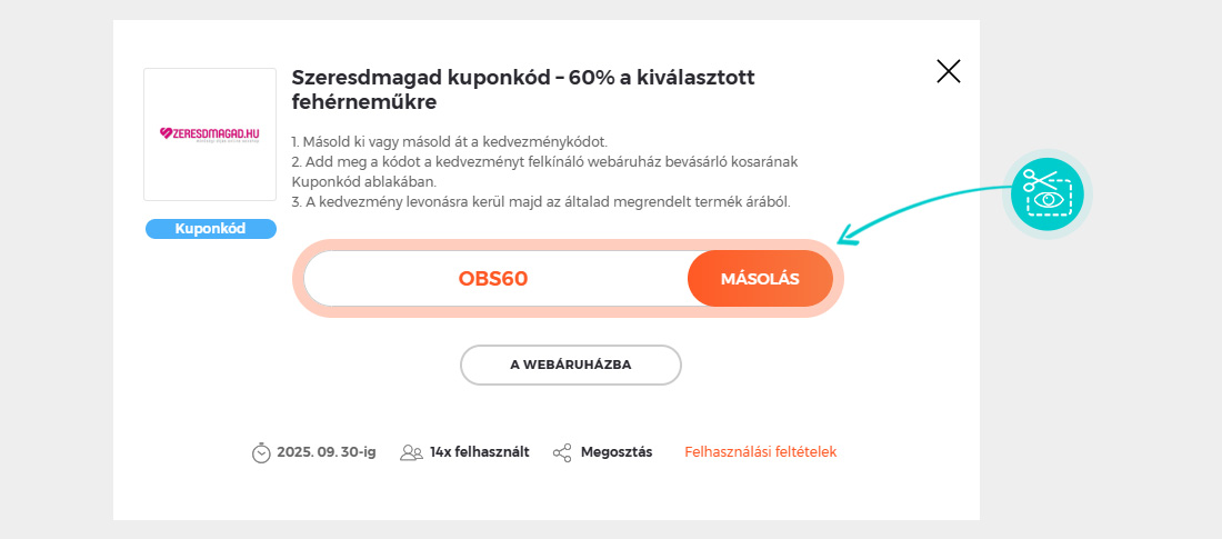 Másold ki vagy másold át a kódot és kattints „A webáruházba” gombra. Ezt követően átirányítunk a Szeresdmagad webáruházba.