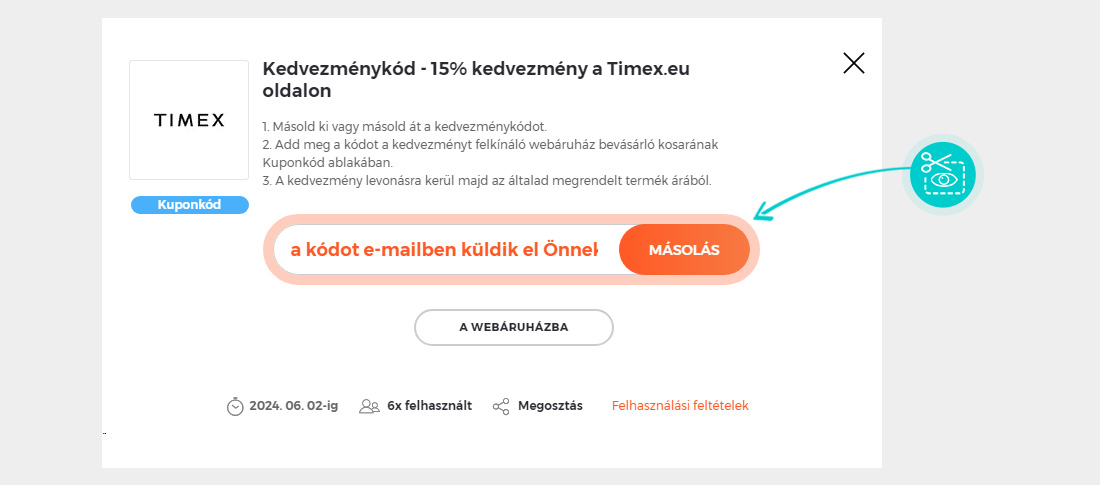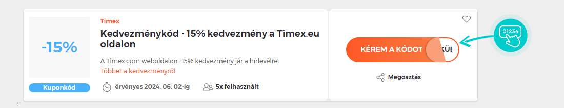 Válassz ki egy kedvezménykódot, amelyet szeretnél felhasználni a Timex.eu webáruházban. Kattints a narancssárga "Kérem a kódot" gombra!