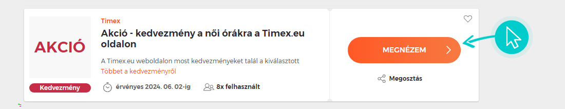 Válassz ki egyet a Timex kedvezmények közül és kattints a „Megnézem” gombra. Ezt követően átirányítunk a Timex webáruházba egyenesen a Timex.eu akciós kínálatához, ahol megvásárolhatod a terméket kedvezményesen.