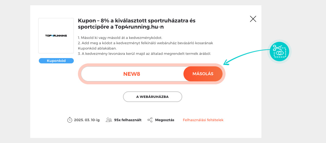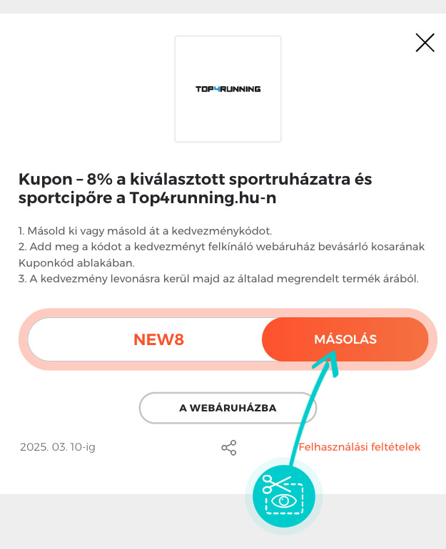 Másold ki vagy másold át a kódot és kattints „A webáruházba” gombra. Ezt követően átirányítunk a Top4running webáruházba