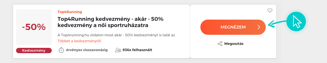 Válassz ki egyet a Top4running kedvezmények közül és kattints a „Megnézem” gombra. Ezt követően átirányítunk a Top4running webáruházba egyenesen a Top4running akciós kínálatához, ahol megvásárolhatod a terméket kedvezményesen.