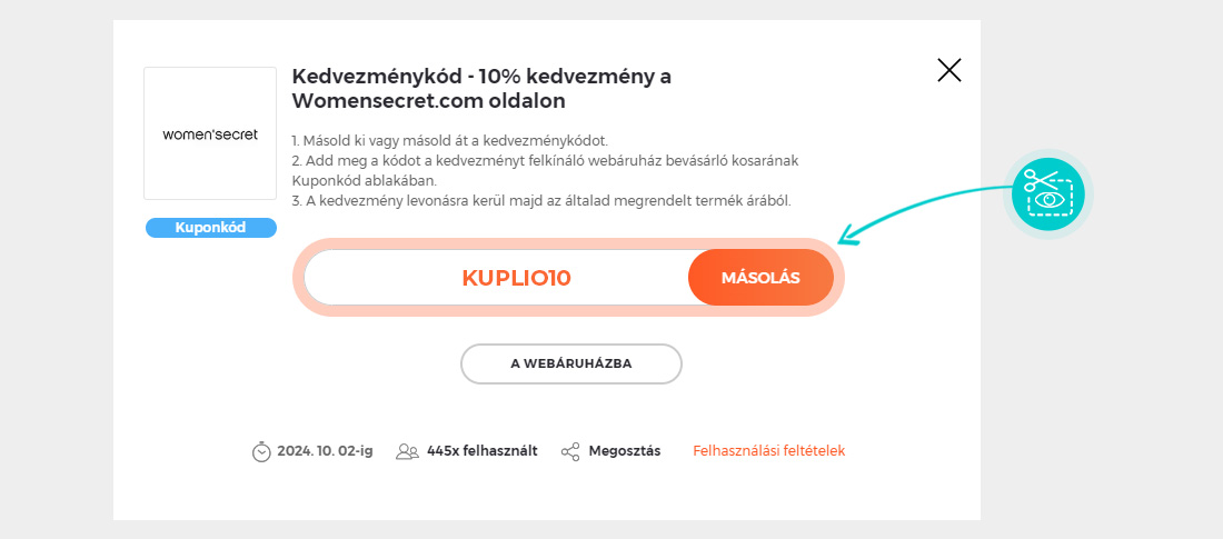 Másold ki vagy másold át a kódot és kattints „A webáruházba” gombra. Ezt követően átirányítunk a Womensecret.com webáruházba.
