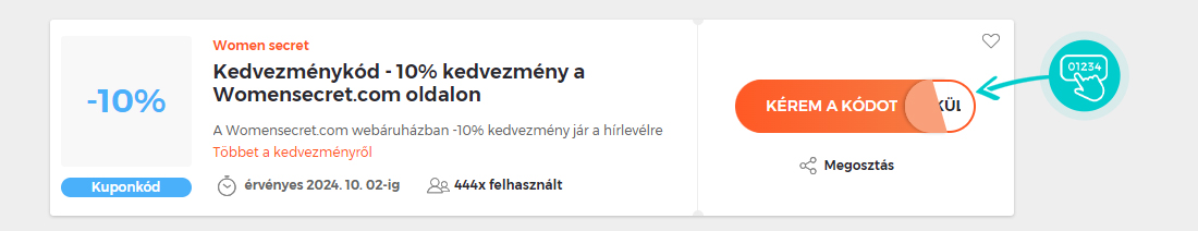 Válassz ki egy kedvezménykódot, amelyet szeretnél felhasználni a Womensecret.com webáruházban. Kattints a narancssárga "Kérem a kódot" gombra!