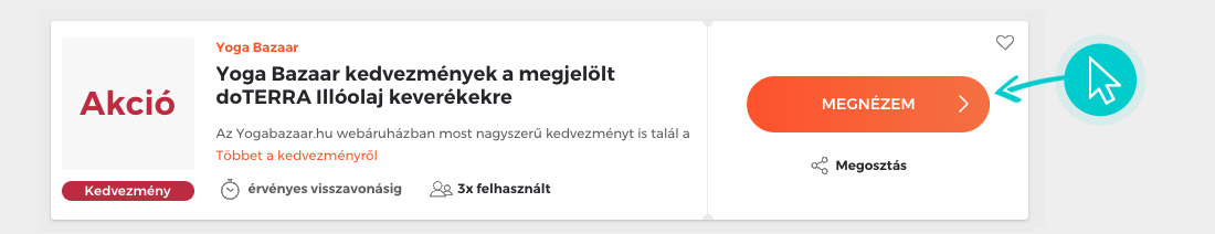 Válassz ki egyet a Yoga Bazaar kedvezmények közül és kattints a „Megnézem” gombra. Ezt követően átirányítunk a Yoga Bazaar webáruházba egyenesen a Yogabazaar.hu akciós kínálatához, ahol megvásárolhatod a terméket kedvezményesen.