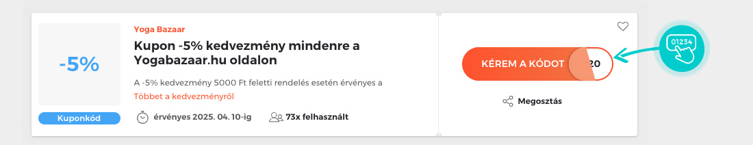 Válassz ki egy kedvezménykódot, amelyet szeretnél felhasználni a Yogabazaar.hu webáruházban. Kattints a narancssárga "Kérem a kódot" gombra!